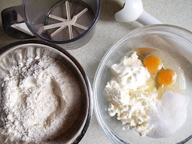 Į varškės masę dalimis suberiame miltų mišinį ir išminkome tešlą. Tešla turėtų gautis elastinga ir nelimpanti prie rankų, jei reikia įberiame dar miltų.